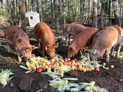 Although we would like to, currently we don't keep breeding stock for pigs so we cannot sell our pork as Certified Organic. We purchase piglets from local farms and raise them from young to finish. Our pigs receive a Certified Organic ration, our grassfed milk, fallen fruit and whatever goodies they can find in the forest/pasture edge. This allows our pigs to express their natural instincts such as rooting, wallowing, and sprinting! If you've ever come by the farm you may have had the pleasure of watching the pigs and their antics!